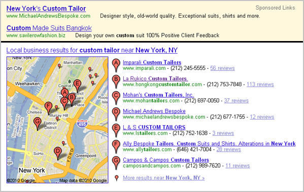 For example, you are looking for custom tailors in New York. If you search for (“Custom Tailor New York” for example), the Google algorithm has the built in local search intelligence that the query calls for results primarily local in scope. As seen in the diagram above, it lists tailors from New York according to their relevance to your search query. Also, you would notice that the local search results are displayed on the top before the organic search results.